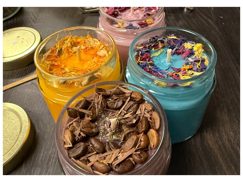 Our instructor will guide you through the entire process – from wax selection to proper pouring and decorating. You will learn how to choose a suitable wick, how wax behaves when cooling, and how to properly care for the candle so it burns as long as possible. Every candle you take home will be an original – handmade with love and respect for nature.