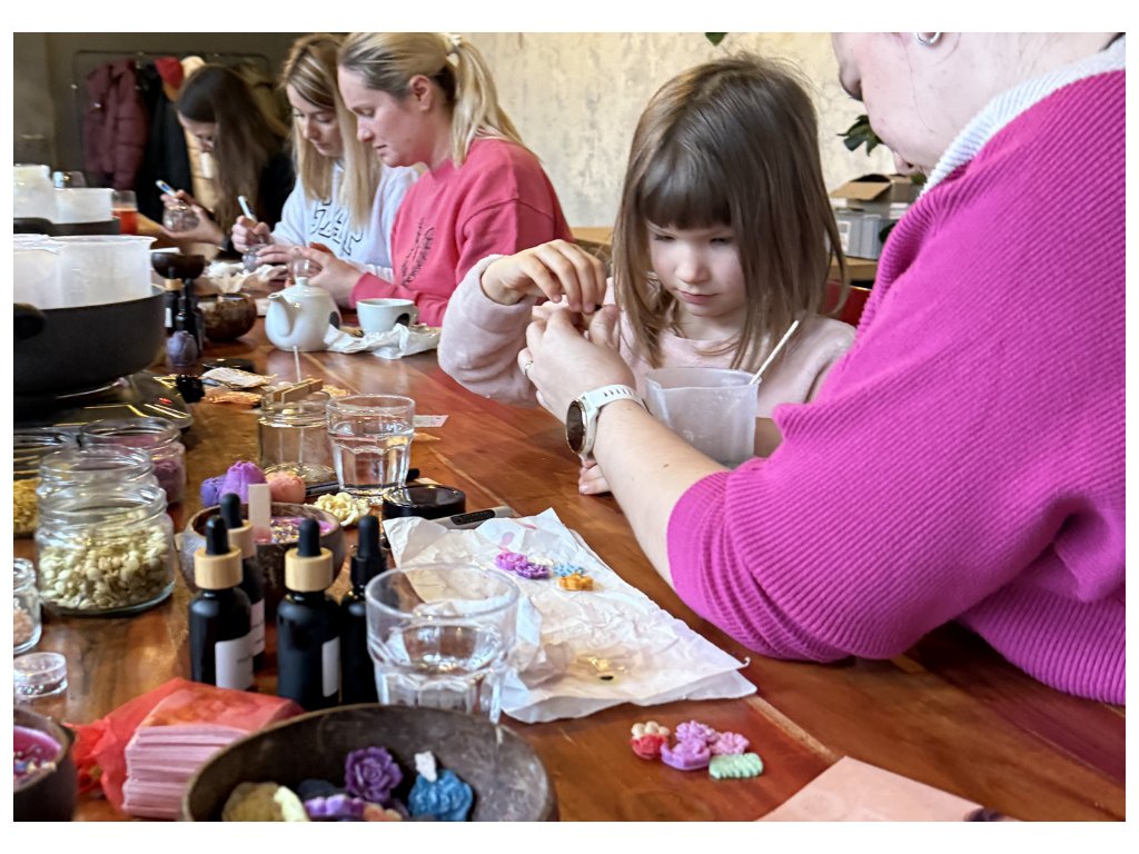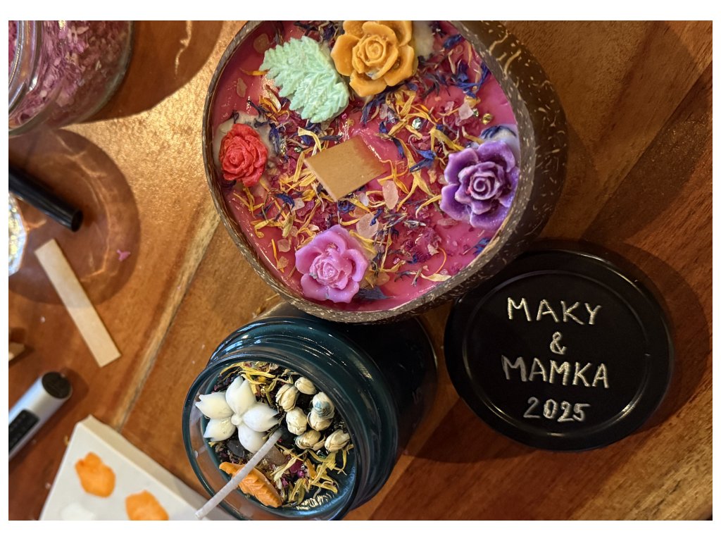 Each candle is made separately, each can have a different scent and color. We decorate with dried flowers, bark, and leaves, such as peony, cornflower, marigold, jasmine, linden, sandalwood, orange, mint, lemon balm, and others. The wax is melted in a water bath and has a temperature of 60 °C when working with it. Our nice and kind teacher knows how to work with children and capture their attention, explain everything to them, and answer all curious questions. The price includes entry for a parent and one child; there is a surcharge of 750 CZK for an additional child.