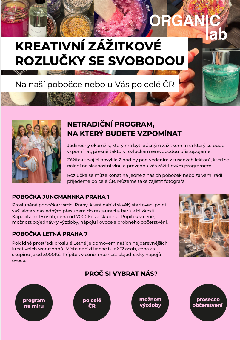 Ideální program před společnou večeří nebo návštěvou baru. Zajistíme přípitek i drobné občerstvení, připravíme program na míru dle zájmů celé skupiny. Nejčastějším programem bývá dvouhodinová výroba mýdel, výroba svíček, výroba krémů nebo parfémy v rozprašovači. V případě zájmu zajišťujeme focení i hudbu. Poskytujeme individuální nacenění se slevou pro skupiny, umíme Vám přizpůsobit termín i na poslední chvíli, máme řadu lektorů a jsme flexibilní. Standardně působíme na pražské Letné, ale rádi zprostředkujeme naše oblíbené prostory po celé Praze nebo v ostatních českých městech.
